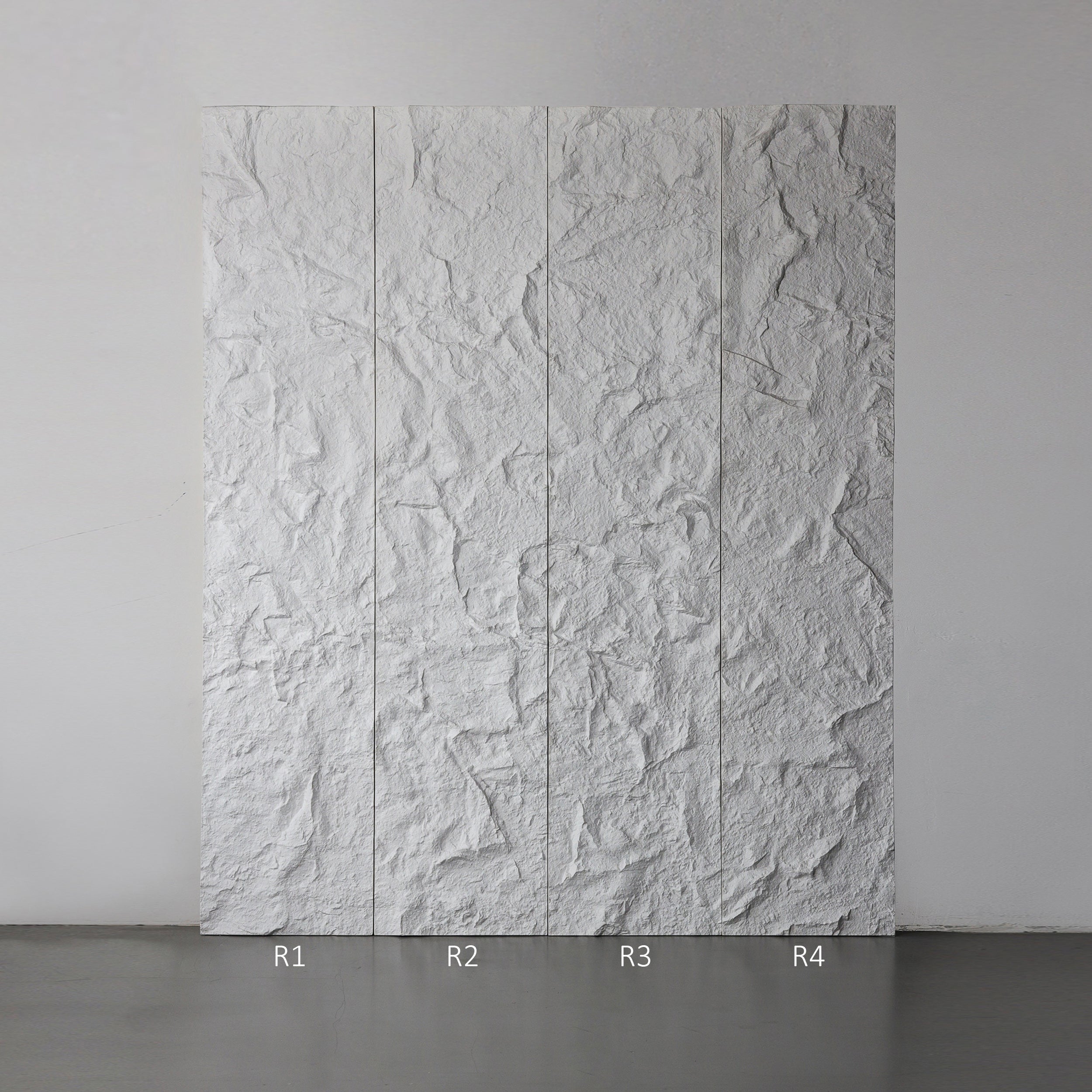 Panele Santero R są modułowe – ich kształty idealnie łączą się po bokach, tworząc ciągły, naturalny wzór skały. Każdy panel ma oznaczenie literowe i strzałkę montażową na tylnej stronie: R1-R2-R3-R4